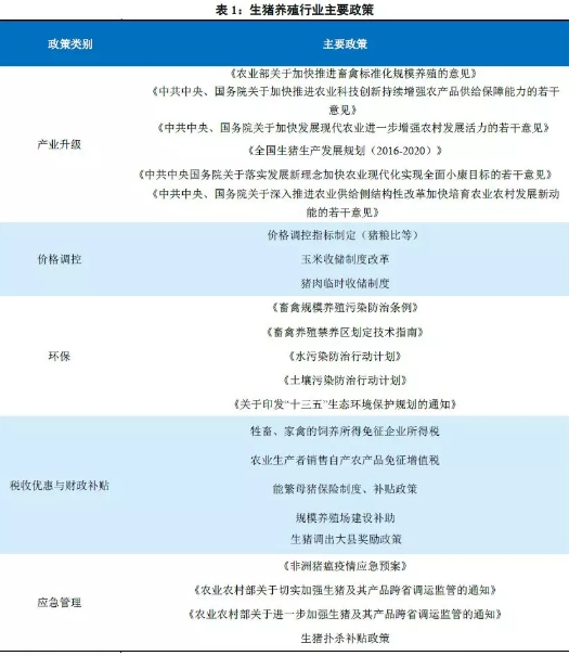 本文将从行业政策脉络出发,分析行业政策对生猪养殖业的影响,进而探讨行业成本构成要素以及大豆、玉米未来价格走势,对短期内生猪企业的成本走势做出预判。 一、行业政策 我国养殖业发展较为落后,行业规模化、现代化、产业化水平均落后于发达国家水平。为此,国家出台多项优惠和扶持政策,以鼓励生猪生产企业向专业化、产业化、标准化、集约化的方向发展。总结来看,行业政策主要围绕产业升级、价格调控、环保、税收与财政补贴以及应急管理等方面制定。 1、产业升级 与发达国家相比,我国生猪养殖产业存在以下差距:规模化和现代化程度低、养殖成本高企等。推动产业升级措施包括: (1)推进生猪规模化养殖小区建设和标准化改造; (2)实施畜禽遗传改良计划,加快培育优异畜禽新品种。我国已核定了约100 家国家生猪核心育种场,以提高生猪育种技术; (3)因地制宜,提出我国生猪四类发展区域。 经过多年的政策推动,生猪养殖产业升级方面取得了以下较为突出的进展: 产业集中度显著提升。2007年至2015年,全国生猪养殖场总户数由8235万户下降至4656万户,同期生猪出栏量分别为6.45亿头和7.08亿头,期间生猪养殖场户均出栏量由7.8头增长至15.4头,户均出栏量翻番,但与美国养殖场平均出栏量800头以上的水平仍存在较大差距。 育种水平提升,推动养殖效率提升和养殖成本下降。目前国内龙头养殖企业已具备自主育种的水平,部分遗传改良技术已接近发达国家水平;具备优良遗传性质的生猪品种可有效降低养殖成本。以产仔率(PSY)指标为例,2009~2017年期间,我国生猪行业平均PSY水平由13上升至19,即同样出栏量所需母猪数量下降约30%。 |
