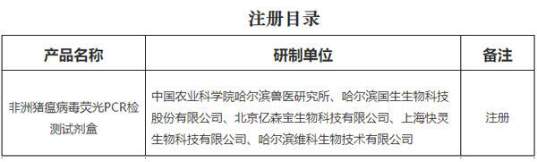 根据《兽药管理条例》和《兽药注册办法》规定,经审查,批准中国农业科学院哈尔滨兽医研究所等5家单位申报的非洲猪瘟病毒荧光PCR检测试剂盒产品注册,并发布产品试行规程、质量标准、说明书和内包装标签。自发布之日起执行。
