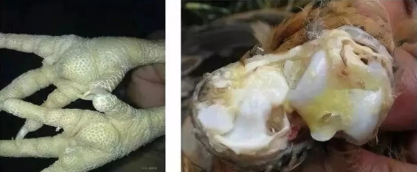 (2)消化系统入口:啄食被污染的物质进入消化系统,比如病鸡的粪便、病鸡啄食过的饲料。 (3)血液途径入口:①垂直传播,发病或携带病原的上一代种鸡通过血液途径传播直接进入雏鸡体内;②被污染的注射器、针头、刺种工具在免疫时直接进入血液循环。 第三、到达靶器官,到哪去? 滑液囊支原体主要侵害的靶器官是龙骨、跗关节和脚垫。 三、发病原因何在? 滑液囊支原体病的发病原因是: 第一,有真凶+有帮凶,两者缺一不可,真凶就是滑液囊支原体病原,帮凶就是影响鸡群抵抗力下降的因素。 第二,当真凶+帮凶的攻击力>鸡群的抵抗力时,鸡群发病。 第三,青年鸡产业的迅猛发展或推波助澜了MS的发生运输与新环境的应激降低了鸡群的抗病力:不可否认MS与支原体、大肠杆菌等一样是条件性致病性疾病。青年鸡跨区域大范围的长途运输销售,不仅扩大了疫病传播的范围,而且在最容易急性发病的4~16周长途运输势必会促进本病的发生(有的在青年鸡场没有病,到养殖户家就发病);对新环境、新笼具的不适应也影响了鸡群的健康。 第四,高密度集约化生产,有利于MS的流行青年鸡场相对传统的个人育雏,普遍饲养规模大、饲养密度大。在这种情况下,管理稍微松懈或生物安全防控不力,就很可能使“星星之火”成为“燎原”之势。 四、发病影响多大? 直接影响:发病的鸡只因为龙骨囊肿、关节及脚垫肿大、滑液囊及肌腱发炎而导致疼痛或瘫痪,进而影响鸡群采食,导致体重、均匀度差,属于慢性消耗性疾病,因为发病后体重严重不达标而导致5-20%的淘汰率,很少直接导致死亡;只有在继发大肠杆菌病时,死亡才明显增加,这种情况直接的死亡原因是大肠杆菌所致,而非滑液囊支原体。 间接影响:影响体重、均匀度,从而间接影响产蛋率,大约影响5-10%之间。 五、如何诊断该病? 滑膜炎的诊断有两个目的:准确诊断病鸡和判断是否携带病原。 1、病鸡好诊断吗? 剖检时,发病早期大多数在关节、腱鞘呈明显的肿胀,有一种粘稠的、乳酪色至灰白色渗出物存在。病程长者渗出物呈干酪样,被感染关节表面常为黄色或桔红色,特征性渗出物量以跗关节、翼关节或足垫较多,关节膜增厚,关节肿大突出。 |