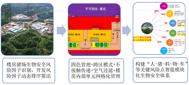 五、楼房猪场生物安全的初级实践 1、概况 从2020年项目建成以来,严格采用“四色管理+跨区模式+不接触传递+空气过滤“等措施,重点监控由外部进入场内与猪发生接触的各种生产活动,如猪/车/人/物等进入生产区,必须通过相应处置流程,确保不会带入ASFv等重大病原。楼房内部加强防交叉操作,以每个单元做分区管理,防止随意交叉。楼房猪场整体执行“红橙黄绿”四色管理,重点做好人员、物资(饲料、厨房冻品等)、猪只出入口、无害化处理等关键关口的管理(如图5)。猪只销售100%执行中转销售,通过内部的中转舍内部先中转,再转到完全独立的销售中转中心(配置防回头装置)对猪只进行销售。 图5 广东智基智农楼房猪场模块化生物安全示意图 2、楼房猪场生物安全控制的关键环节如图6