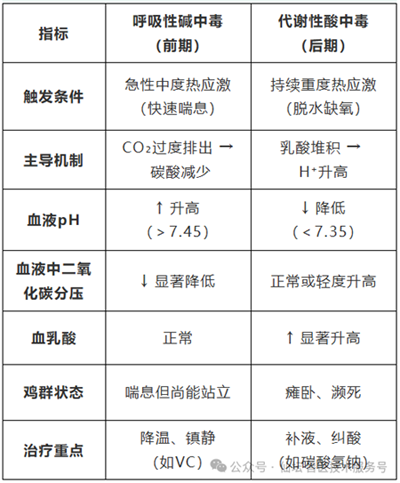 肉鸡热应激引发的酸、碱中毒类型取决于热应激的强度、持续时间及鸡体的代偿反应,主要分为以下两种情况: 一、热应激前期:呼吸性碱中毒(碱性中毒) 1、发生时机:当鸡群在急性、中度以上热应激(环境温度>32℃)时,鸡通过快速喘息(热喘息)散热,此时易发生呼吸性碱中毒(血液pH升高)。 2、发生机制: 2.1 过度通气:鸡张口呼吸、频率加快(可达150~250次/分钟),大量排出CO₂,导致血液中二氧化碳分压(PaCO₂)急剧下降。 2.2 碳酸减少:CO₂+ H₂O → H₂CO₃→ H⁺+ HCO₃⁻(可逆反应向左移动)。血液中H₂CO₃(碳酸)减少,HCO₃⁻相对过剩 → 血液pH升高(碱中毒)。 3、临床表现:呼吸急促、翅膀张开、站立不稳 - 血液pH>7.45,PaCO₂显著降低,轻症时无瘫痪(与代谢性酸中毒不同)。 二、热应激后期:代谢性酸中毒(酸性中毒) 1、发生时机:当热应激持续数小时以上,或鸡群处于重度热应激(濒临热衰竭) 时,可能转为代谢性酸中毒(血液pH降低)。 2、发生机制: 2.1 缺氧与无氧代谢:持续喘息导致呼吸肌疲劳,氧气摄入不足 → 组织缺氧。细胞转向无氧糖酵解 → 大量生成乳酸、酮酸等有机酸 → 血液H⁺浓度升高。 2.2 脱水与循环衰竭:大量水分通过呼吸蒸发 →血液浓缩、循环障碍 → 酸性代谢产物堆积。 2.3 肾脏代偿不足:脱水导致肾血流量减少 → 酸性物质排泄受阻。 3、临床表现:精神萎靡、瘫卧不动、脚爪冰凉,血液pH<7.35,乳酸含量升高, 死亡率急剧增加(热射病)。 关键对比表注意:代谢性酸中毒需补充碱性物质,但必须在确诊后使用(盲目补碱会加重呼吸性碱中毒)! |
