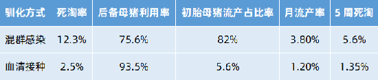 4、方案禁用情况 高致病性蓝耳病毒猪场、爆发场禁用此方案,避免毒株扩散或毒力返强。 5、血清驯化配套管理措施 驯化时机:50kg左右的后备母猪(种源单一、批次化)进场隔离3周后进行,即在120-130日龄(体重65公斤左右)开始。 环境控制:隔离舍需独立设置,与生产线猪舍保持至少3000米距离,工具专用并严格消毒如引种前7天使用1:200过硫酸氢钾复合盐全面消毒,进出车辆经火碱池(2:100)消毒,人员淋浴更衣。 效果监测:血清接种后21天定期采集口腔液或血清,通过ELISA检测抗体水平,评估驯化成功率。 三、血清驯化成功标志与入群时机 1、临床观察:血清肌注后3~5天可能出现短暂轻度发热、厌食等症状,严重症状提示病毒剂量过高或猪群健康不佳,死淘率可能在3~8%承受范围内。 2、实验室检测:驯化后3周开始检测血清抗体(ELISA),要求抗体阳性率100%;每2周检测病毒血症(PCR),驯化结束前(驯化期为8周)需>90%个体转为阴性;口腔液PCR辅助评估群体排毒状态(CT值>38为达标)。 3、入群标准与时机 核心标准:临床症状稳定,抗体S/P值<2.5且变异系数<30%,病毒血症转阴率>90%,口腔液PCR阴性(CT值>38为达标)。 入群时机:病毒血症清除后需经过4~6周“巩固期”,即进入猪场专门的后备舍饲养巩固,确保免疫系统完全稳定,再进行混群或配种。 四、PRRSV血清驯化成功案例与实践效果 2024年8月份广东某商品化种猪场采用本场血清肌注驯化方式结合中化药方案,到2025年1~5月份实现了死亡率降低和生产成绩的提升,为血清驯化提供了参考依据。 1、案例背景 猪场生产情况,种母猪存栏5000多头,2条线,2500余头/线,周批次生产,600多头/批后备母猪,3批/年(3、6、9月份引种),年更新率36%,采用病猪混群感染(每天1~2小时,持续2周),初始死亡率8%,主要死亡原因是蓝耳病引发呼吸道疾病所致。 2、血清驯化方案 经实验室病毒测序为类NADC-30毒株,非强毒株,每头肌注血清2ml/头(104病毒粒子/ml),1次即可。驯化前1周,饲料中添加50%泰万菌素400g/t+10%复方阿莫西林1kg/t+大华农热毒清或扶正解毒散3kg/t,持续2周;注射长效头孢菌素10ml/头,1次即可;驯化启动后,场内执行2次大华农蓝清威免疫(两次之间间隔21天)。 3、两种驯化方式效果对比 4、经济优势 虽然血清驯化成本高于病猪感染法,配合中化药方案干预后,综合效益远高于混群感染。 |