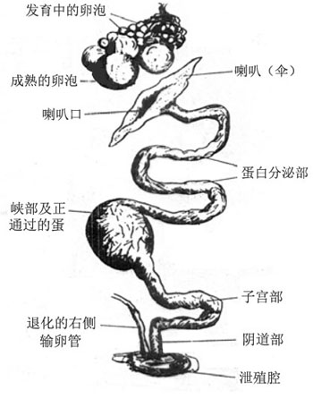 (二)母禽生殖器官 母禽的生殖器官仅左侧发育正常,右侧在早期个体发育过程中退化。 1.卵巢 卵巢以短的卵巢系膜悬挂在左肾前叶腹侧,幼禽为扁平椭圆形,表面呈颗粒状,卵泡小。随着年龄的增长,卵泡不断发育生长,形成一群大小不等的葡萄状卵泡。最大的是成熟卵泡,破裂后将卵子释放出。禽的卵子含有大量积聚的养料即卵黄。 2.输卵管 左输卵管发育完全,是一条长而弯曲的管道,它以系膜悬挂在腹腔背侧偏左,输卵管根据构造和机能可分为下列五类。 1)、漏斗部是输卵管的起始端,四周为输卵管伞,中央有一宽的输卵管腹腔口。它有攫取排出的卵子的功能,也是卵子与精于进行受精作用的部位。 2)、卵白分泌部最长,粘膜形成纵襞;内含丰富的腺体,卵白主要是在这里分泌的。 3)、峡是较窄的一段,在这里形成部分卵白和纤维性的壳膜。 4)、子宫是峡后较宽的部分,卵在这里停留的时间最长。粘膜里含有壳腺,分泌物沉积形成卵壳。 5)、阴道是输卵管的末段,开口于泄殖道的左侧。蛋通过阴道产出,这里仅在壳外形成一层薄的壳角质。