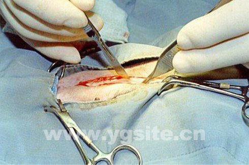 手术方法:术前用犬眠宝合剂全身麻醉,小型犬0.15-0.25毫升,大型犬1毫升左右皮下一次注射。麻醉确实后保定患犬,腹底部剃毛,依次用酒精和碘洒消毒术部并盖上创布,术者在耻骨前缘1厘米左右沿腹白线小心切开皮肤和肌肉,如有大血管应结扎,切开腹腔后,将子宫角小心引出切口,并在其周围缤塞消毒纱布。子宫角大弯处的切口长度以能取出胎儿为宜,取出胎儿时助手手提子宫,避免子宫掉入腹腔,取出胎儿后注意断脐和剥去胎盘。助手擦干胎儿全身并将其移入保暖处,缝合子宫前应用生理盐水反复冲洗子宫,其后依次连续和内翻缝合子宫,小心缝合腹膜、腹肌,随即缝合皮肤,解除保定,10日后拆除皮肤缝线。一般情况下,整个手术过程需35分钟左右。
