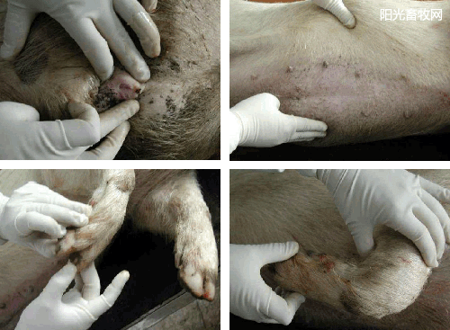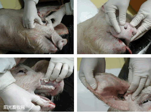 检查四肢、眼结膜的颜色、皮肤等有无异常,下颌淋巴结是否有肿胀现象等。用肉眼观察猪的外观,如皮肤,眼结膜-(苍白---附红细胞,黄疸—败血症---链球菌,猪瘟,付猪嗜血),粪(大便中有粘膜---可能是猪瘟) ,尿(血尿—衣原体,钩端螺旋体),口腔,耳朵(耳朵边上卷---弓形体),鼻腔,腹股沟淋巴结(肿大至3-5倍---圆环病),蹄部。还有,亚急性猪丹毒时,或见到皮肤大小比较一致的方形、菱形或圆形疹块;急性猪瘟,皮肤多有密集的或散在的出血点(或淤血点);口蹄疫时四肢、口腔有水疱;猪疥螨病猪皮肤粗糙有皮屑、背毛脱落、皮肤潮红甚至出血有痂皮;猪链球菌病皮肤有突起的脓包,切开脓包流出淡黄色液体;附红细胞体病时眼结膜黄染。肛门附近有无粪便污染等。
