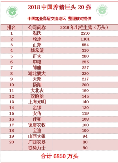 由于2015-2017年猪价进入高位,养猪获利效应明显,推动了规模化养猪的跨越式发展,多家企业规划规模超1000万头。如今2018年已经过去,谁能跻身行业规模20强?中国猪业高层交流论坛组委会做了大量工作,进行了统计和核实。除上市公司已对外明确宣布外,对非上市公司均进行了亲自核实,已确保数据的准确性。在此,感谢组委会会长李俊柱先生亲自核实。