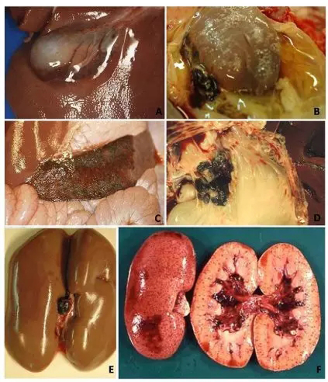 2.2 亚急性ASF: 猪只呈现腹水、心包积液和胆囊和胆管壁的特征性水肿(图A),以及肾周水肿(图B)。脾脏初始表现为部分充血性脾肿大(图C),逐渐转归,留下一些病灶损害,最终消失。淋巴结,主要是胃肝(图D)和肾淋巴结(图E),以及颌下腺、咽后、纵隔、肠系膜和腹股沟淋巴结出血、水肿和易碎,表现为深红色血肿(Sanchez-Vizcaınoand Arias, 2012; Gomez-Villamandos et al., 2013)。肾出血(图F)比急性ASF形式更强烈(瘀点和瘀斑)和更广泛的(皮质、髓质和骨盆)(Gomez-Villamandoset al., 1995a; Hervas et al., 1996)。 亚急性猪瘟的病理变化:胆囊壁(A)和肾周围的显著的水肿(B);C:脾肿大;胃肝(D)和肾淋巴结(E)出血水肿;F:肾、皮质、髓质和肾盂有大量出血。(Sanchez-Vizcaıno et al 2015) |