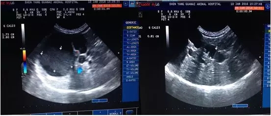 6.影像学检查 超声肝脾肾、胰腺、腹腔淋巴结、腹膜腔未见异常;可见胆囊扩张,胆汁淤积,总胆管扩张直径8mm,部分肝内胆管扩张,肝脏整体回声增高。 三、初步诊断 肝吸虫感染,胆管堵塞,胆管性肝炎。 四、治疗方式 1、治疗 预设治疗方案:(1)胆囊切开术+胆管疏通(2)胆囊十二指肠吻合术+胆管疏通。 术前准备及手术过程:患猫左前肢头静脉埋置24G留置针;术前给予不含乳酸的林格氏液纠正脱水及电解质紊乱;注射维生素K1,0.5mg/kg SQ;术前使用抗生素速诺0.1ml/kg SQ,头孢唑啉 20mg/kg iv;地佐辛0.5mg/kg SQ,安定0.2mg/kg iv 作为麻醉前镇痛镇静剂,丙泊酚3mg/kg 作为诱导麻醉剂,静脉推注至眼见反射消失、上下颚张力减弱,咽喉部给予利多卡因喷雾剂15秒后插入4.0号气管插管,充盈气管插管套囊(压力20mmH2O),动物仰卧保定,连接麻醉机,确诊不漏气后,打开挥发罐至3%异氟烷吸入麻醉,并以10次/min的频率进行正压通气。双眼给予红霉素眼药膏,以避免角膜干燥;连接心电血氧及血压监护;腋下至骨盆耻骨前缘进行大面积剃毛备皮,消毒,铺盖创巾及辅料,创巾钳进行固定;检测动物麻醉深度、心率、血氧饱和度、血压、体温,根据情况调整麻醉药浓度。 |