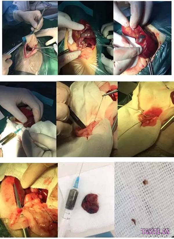 腹部中线剑状软骨至脐部常规打开腹腔,切除镰状韧带以获得更好的术野(图片一);将胆囊及邻近肝叶牵拉出腹腔外暴露胆囊和胆管,可见明显的胆囊胆管扩张,肝脏表面不光滑、颜色不一(图片二),胆囊顶部胆囊壁颜色发绀、胆囊壁变薄,可能存在局部胆囊壁问题(图片三);将胆囊周围垫上浸有生理盐水的灭菌纱布加以保护,用注射器抽出胆囊内的胆汁,以免手术中漏出胆汁(图片四);顺着胆总管找到在十二指肠乳头(一般在距离幽门3~6cm肠系膜粘膜边缘处)的胆管开口位置,总胆管会在肠壁内延伸大约0.5cm~1cm左右,所以笔者建议十二指肠开口的中心点应该后移1cm,纵向切开十二指肠切口长度约2cm左右,找到胆管十二指肠开口处,可见开口处存在堵塞物,取出后确定为两个肝片吸虫成虫(图片五),插入软质猫1.3导尿管进行物理性疏通胆总管(图片六);因为笔者担心局部胆囊壁异常情况和胆总管再次堵塞的情况出现,选择进行部分胆囊切除术,在胆囊上放置牵引线,将胆囊拉向一边,用顿剪剪开胆囊附着于肝脏的脏膜,钝性分离使胆囊从肝小窝中游离出来,分离中难免会出血,钝性分离过程为避免胆囊壁受损破裂偏于肝脏侧漏出了胆小管并有少量胆汁流出,轻轻抻拉并进行了结扎,再次在下方及周围用无菌纱布进行隔离,继续分离到胆囊管位置,尝试对合十二指肠开口处与胆囊尾端预切除位置之间确定无明显张力的情况下,于胆囊尾部留置牵引线铺垫好灭菌隔离纱布直接切除部分问题胆囊(图片七),用胆管十二指肠开口处的导管进行逆向冲洗,做好隔离工作防止冲洗液及胆汁进入腹腔,冲洗中发现导管很难直接逆向从胆囊穿出,进行冲洗时冲洗液只有一半会从胆囊处流出起到冲洗作用,其余可能进入到了汇集与胆总管的肝管中,冲洗并未见更多的成虫,为防止肝胆管内可能存在未清除的虫体再次造成胆管开口的堵塞,直接进行了胆囊尾端与十二指肠吻合术(图片八),吻合方式为简单间断性缝合方式,牵拉出大网膜保存网膜上的主要血管对部分网膜进行修剪延长,并进行吻合处大网膜的环绕式遮盖,彻底冲洗腹腔,常规闭合腹腔。 |