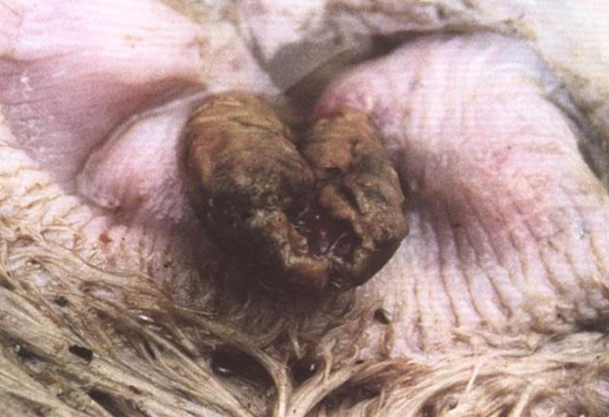 气管出血  外生殖器突出,粘膜坏死 4、防治措施 (1) 预防措施。主要是搞好环境卫生,加强鸭群饲养管理。特别要注意下列方面:检查水源是否被大肠杆菌污染,如有则应彻底更换;注意育雏期保温及饲养密度,改善通风,降低灰尘,勤于除粪,减少氨气的含量;鸭舍、孵化器及用具经常清洁和消毒;种鸭场应及时集蛋。平时可使用抗生素类药物进行预防,尽力防止寄生虫等病的发生。 (2) 接种菌苗。国内常用疫苗有大肠杆菌甲醛灭活苗和大肠杆菌灭活油乳苗两种,最好是用自发病鸭分离的大肠杆菌株制备多价疫苗进行免疫,可有效地控制本病的发生。 (3) 治疗方法。可选用敏感抗生素药物治疗。