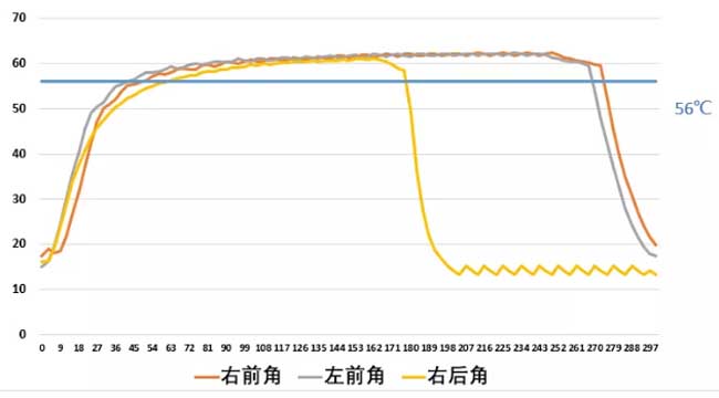 图13 沥水无风机组温度曲线 图14 未沥水有风机组温度曲线 一次典型实验测定的温度数据曲线图见图12、图13、图14,到达56℃所需时间和烘烤过程56℃以上维持时间统计数值见表2。组1、组2与组3结果对比可以看出,未沥水组烘烤后,车厢中仍存在有余水,且部分位点无法达到烘烤要求。说明沥水对于车辆烘烤效果非常关键。 组1、组3与组2对比,尾部风机能明显缩短到达目标温度时间,使车厢内各处温度相对更加均匀,维持的时间更接近。有意思的是没有尾部风机,第一层左前角和右前角维持的时间反而比有尾部风机的更长,但是无风机的右后角维持温度的时间最短。发生这种情况的原因在于若没有尾部风机,车厢内外缺乏循环,开机160分钟后一旦烘干机停止工作,车厢内左右前角的热量相比有尾部风机的散发更缓慢,而无尾部风机的车厢右后角由于热量迅速散发,温度迅速降低,导致维持时间缩短。车厢内各个温度位点达到目标温度的时间和维持温度的时间越接近,越有利于我们缩短烘烤时间和节约成本。 |
