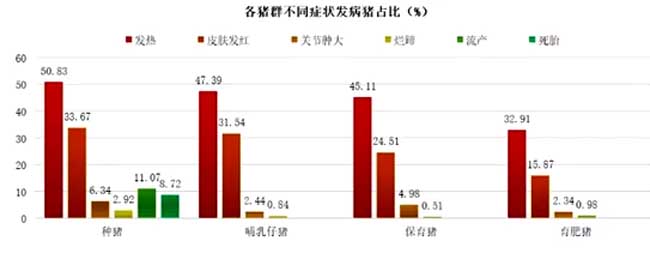 通过统计不同发病组合的养殖场占比发现,仅仔猪发病的占2.73%,仅育肥猪发病的占8.30%,仅种猪发病的占23.11%。与种猪发病有关的,总占比51.74%;与仔猪发病有关的,总占比18.84%;与育肥猪发病有关的,总占比21.06%。 从猪群发病模型来看,传入猪场的最主要原因是引种或淘汰。引种和与种猪饲养过程有关的活动是目前引起猪群发生非洲猪瘟的最主要的原因。因此,在防控非洲猪瘟的过程中,要高度重视种猪及引种工具的管理。 4、临床症状:呈现多样性 从2018年以来,我们对非洲猪瘟的认识逐渐加深。疫情初期,发病率和死亡率均较高。随着疫情的发展,发病率和死亡率有一定程度的降低。但是临床症状发生了较大的变化,呈现多样性。其中,发热、皮肤发红症状最为多见,母猪有一定比例的流产和死胎现象。 对种猪、哺乳仔猪、保育猪和育肥猪的不同症状发病猪占比进行简要分析,其中,发病的种猪群中,50.83%有体温升高的特征,33.67%有皮肤发红的特征,关节肿大者占6.34%,烂蹄者占2.92%,流产者占11.07%,死胎数增加的占8.72%。而哺乳仔猪、保育猪和育肥猪的临床症状中,发热、皮肤发红占比较多,关节肿大、烂蹄较少。 需要注意的是,从临床症状上很难做出非洲猪瘟的明确诊断,非洲猪瘟的鉴别诊断必须依靠实验室技术手段。 5、传染源:污染面广 传染面方面,污染面广,生猪、车辆、环境、物料人员等均有不同程度的污染;毒株呈现多样性特点,强毒株与变异株共存。 从环境、猪场、猪、人员的检测结果,非洲猪瘟毒株呈现多样性。 从监测情况看,开展监测企业很多,有合理监测方案的较少,试剂盒种类繁多。 从调查的1918个猪场的情况看,有70%的猪场开展了监测,30%的猪场没有开展非洲猪瘟监测。有17%的猪场有监测方案,53%的猪场没有监测方案。 检测是发现非洲猪瘟的一个非常重要的手段。很多猪场有检测行为但没有监测方案,不仅效率低下,还容易影响检测结果分析的准确性。另外,有些猪场的检测费用远超其他防控费用,这一点是非常不正常的。猪场在检测时,要注意找出高风险点,并对这些风险点进行监测和定期检测。 目前国内非洲猪瘟检测试剂盒主要有三种。第一种是有核酸提取的试剂盒,它的特点是灵敏度高,特异性好。第二种是免核酸提取的试剂盒,它的特点是快速,但灵敏度相对较低。第三种是最早使用的试剂盒。 |