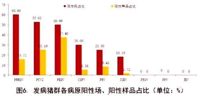 从腹泻、猪蓝耳病和猪瘟的发病情况来看,2018年开始,腹泻呈现较为明显的下降趋势,但今年以来,腹泻的群流行率较2020年上升了近10%;猪蓝耳病方面,今年的群流行率也呈上升趋势;猪瘟的群流行率较为平稳。总体来看,今年猪群病毒性疫病流行形势较去年严峻,除了非洲猪瘟之外,我们还需要对猪蓝耳病、腹泻等疫病引起足够的重视。 2、猪群疫病空间分布情况 从疫病的空间分布情况来看,腹泻群流行率最高的是西南地区(51.62%),其次是华北地区(37.78%);猪蓝耳病群流行率最高的是华中地区(32.69%),其次是东北地区(25.88%)。 副猪嗜血杆菌病发病最多的是华东地区(17.40%),其次是西南地区(12.99%);猪伪狂犬病发病相对最高的是华南地区(6.55%),其次是西南地区(5.84%)。 猪支原体肺炎的发病情况与圆环病毒2型高度一致,其中,发病最多的是东北地区,其次是华中地区。 猪丹毒发病最多的是东北地区(7.45%),其次是华北地区(2.22%);猪瘟发病最多的是华中地区(6.15%),其次是华南地区(3.93%)。 3、猪群疫病种群分布情况 通过对猪场规模与疫病发生情况进行分析,结果显示,腹泻发病率最高的是101~200头规模的猪场,猪蓝耳病发病率较高的是100头以下的猪场和201~500头规模的猪场。总体来看,我国猪群疫病的发生情况与猪场规模没有显著的关系。 经对2020年所收集的样品进行多病原检测,结果显示,PRRSV、PCV2、PEDV、CSFV、PRV、TCEV阳性场占比分别为60%、52.63%、50%、30%和18.18%。从病原感染强度来看,PRRSV位列第一。病原感染强度与临床调查的群流行率情况基本吻合。 |