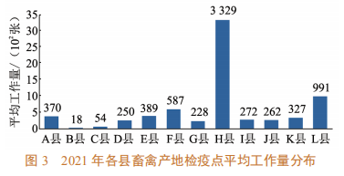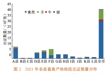 2.2 动物检疫情况 2.2.1 产地检疫 全市现有产地检疫申报点 133个,其中县级 6 个、乡级 127 个。2021 年全市共实施产地检疫畜禽 229.84 万(头 / 只 / 羽),较机构改革前增加 75.51 万,出具动物检疫合格证明40 786 张。 由图2 可知:产地检疫申报点主要集中在北部 A、D、E、F、G 县,A 县出证数量和检疫数量最多,以生猪检疫为主,F 县是羊调出大县,而 B 县的出证数量及检疫数量均最低(畜产品以县内消费为主);全市以生猪、羊检疫为主,而禽类检疫数量最少。产地检疫工作量方面,用开证数 /开证点数量(张 / 个)表示各县产地检疫的平均工作量。 由图3 可知:全市平均工作量约 307 张 / 个 (40 786/133),检疫工作量最大的 H 县与最小的 B 县相差约 185 倍,各县的平均工作量并不均衡。 2.2.2 屠宰检疫 全市现有畜禽屠宰场点 28 个,对应设立畜禽屠宰检疫申报点 28 个。2021 年共实施屠宰检疫畜禽 840 657 头(只 / 羽),其中生猪485 745 头、牛 5 741 头、羊 315 511 只、鸡 33 660羽(图4)。屠宰检疫申报点在 B 和 F 县分布较多,I 县暂无畜禽屠宰企业,相应也就没有屠宰检疫申报点;E 县屠宰企业种类较为齐全,有牛羊屠宰企 业 1 家、生猪屠宰企业 1 家、家禽屠宰企业 1 家,对应设立检疫申报点各 1 个;全市只有 I 县和 L 县 无生猪定点屠宰厂,仅 A、E、L 和 H 县有牛屠宰检疫申报点,但屠宰检疫数量都不大。从屠宰检疫动物种类来看(图4),全市以猪、羊屠宰检疫为主,其中生猪屠宰检疫数量较高的 4 个县为 A、B、 F 和 G 县,羊屠宰检疫数量较多是 A、E 和 F 县。 |