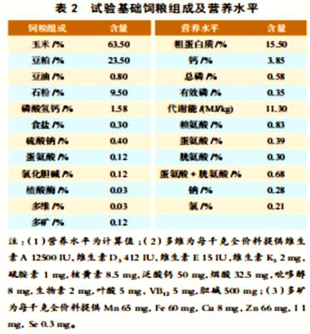 1.4 饲养管理 采用封闭式鸡舍3层立体笼养,每排相连的4个鸡笼为1个重复,每笼4只鸡,各重复平均分布在6排叠层笼养架上。早晚补光,光照(16L:8D)强度20 Lx。自然通风和负压通风相结合。每天布料2次,匀料4次,自由采食 ;乳头式饮水器,自由饮水;每日14:00捡蛋1次,并记录相关数据。 1.5 试验指标测定与方法 1.5.1 产蛋性能 以重复为单位记录每天产蛋数、日产蛋总重量、死亡鸡数,每2周记录鸡的耗料量1次。计算每2周和全期的产蛋率、日采食量、料蛋比、平均蛋重、日产蛋量等生产性能指标。 1.5.2 鸡蛋品质 在试验的2周末和4周末,以重复为单位,每重复、每次采集接近重复平均蛋重的样品5枚,测定相关指标。蛋壳强度分析仪(Egg Force Reader,Orka Technology Ltd.)测定蛋壳强度 ;蛋壳厚度测定仪(Egg ShellThickness Gauge,Orka Technology Ltd.)测定蛋壳厚度 ;蛋白高度、蛋黄颜色和哈氏单位采用蛋品质自动分析仪(Egg Analyzer TM,OrkaTechnology Ltd.)测定 ;蛋形指数采用日本富士坪公司(Fujihira Industry Co.,Ltd)生产的蛋形指数测定仪测定。 1.6 统计分析 试验数据使用SAS 9.4(SAS Institute,2008)的GLM 程序进行统计分析。每重复作为生产性能的统计单位。Tukey HSD 检验用于组间的多重比较,P 值小于或等于0.05代表组间差异显著。 |