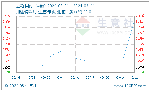 据生意社商品行情分析系统显示:3月开始,利多来袭,国内豆粕行情迎来涨情,行情振荡上涨。截止3月11日,豆粕市场均价3504元/吨,价格较3月初上涨6.44%。 利多支撑 国内豆粕行情振荡上涨 3月以来,豆粕行情处于低位,贸易商看空为主,存货较少。USDA报告中性偏多,期货行情上涨,大豆油厂抬价,贸易商逢涨买进,豆粕行情迎来大涨行情,单日上涨5.42%。 生意社农产品分析师李冰认为:期货行情拉涨持续动力不足,后市豆粕行情或将继续弱势下跌为主。 |