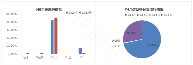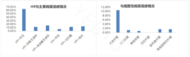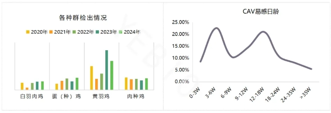 2.1 家禽H9N2亚型禽流感主要流行基因型 目前流行基因型主要为Y4谱系,占到总阳性率的84.59%;其中又以Y4.1.1和Y4.1.4分支检出率最高;以严重气管充出血为主要临床特征。 今年以来Y1分支检出持续增加,实验室研究发现Y1分支与WJ和Y4分支交叉HI较低,交叉免疫攻毒保护不完全,同时Y1临床毒力较强,对鸡群影响较大,因此需密切关注Y1的流行趋势与防控。 图8 H9N2亚型禽流感主要流行基因型 2.2 H9亚型禽流感与重点疫病混感情况 H9亚型禽流感临床上普遍存在混感现象,其中与IB混感比例最高,占比63.92%;免疫抑制类疫病(CAV、ARV、IBD等)亦可增加H9亚型禽流感的感染风险。临床上H9亚型禽流感继发细菌感染往往造成严重预后不良及伤亡,此外,需关注大日龄蛋/种鸡H9亚型禽流感与IC混感造成严重临床表现问题。 图9 H9与重点疫病混感情况 针对H9亚型禽流感的防控建议加强管理,特别是通风管理,避免应激;同时实时监控疫情发展,重视生物安全防控;选择合适疫苗,保证疫苗与流行毒株高度匹配。 3、鸡传染性贫血(CAV) 各阶段、各品种的鸡均可感染,传贫小日龄感染可引起鸡群死淘率上升、贫血等;大日龄以带毒为主;近年来发病日龄拓宽趋势显著,育成期蛋/种鸡典型发病案例(消瘦、腿肌出血等)逐渐增多。 图10 CAV流行情况 |