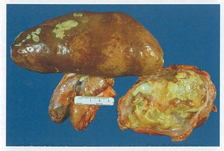 2. 毒素: ① 霉菌毒素(如玉米赤霉烯酮)通过直接的细胞毒性、免疫介导的损伤、代谢紊乱、血管损伤等,最终导致肾脏结构和功能的损害,诱发肾盂肾炎。 ② 药物过量(如磺胺类)通过药物结晶沉积、免疫介导的损伤、代谢产物毒性等多种机制导致肾盂损伤。 ③ 重金属中毒则通过金属直接毒性、免疫介导的炎症反应、肾小管和肾小球损伤,以及慢性积累导致的纤维化引起肾盂肾炎。 3. 免疫因素:免疫复合物沉积(如过敏反应)也能引起肾盂肾炎。 (三)肾盂肾炎的临床诊断 临床症状观察:观察现场猪只是否有肾盂肾炎类似的临床症状。 组织学病变:急性肾盂肾炎时,肾脏通常肿大、质地变软,肾锥体和肾盂黏膜出血。严重者可见肾盂由于渗出物和组织碎屑的积聚而扩大,肾乳头坏死,内有灰色无臭的黏性脓性渗出物,或混有纤维素凝块、小凝血块、坏死组织和钙盐颗粒。 图5. 猪放线杆菌感染所致母猪的急性肾盂肾炎 |
