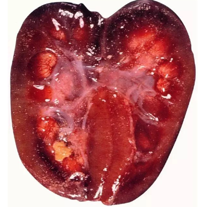 | 图6. 肾小盏肾结石和肾锥体炎症 上图为肾小盏肾结石和肾锥体炎症,多见于尿路细菌感染上行侵袭肾脏引起。 三、膀胱炎-肾盂肾炎导致死亡机制 膀胱炎一般不会造成猪只的急性死亡,但膀胱炎病原菌会扩散至肾脏,引发肾盂肾炎,导致肾脏的滤过功能和重吸收功能受到严重损害,引起体内代谢废物无法正常排出,血中尿素氮、肌酐等毒素水平急剧升高,造成急性肾功能衰竭,最终导致猪只死亡。所以,在出现膀胱炎症状时或者组织病变时,如果观察到一定比例的症状时,需要尽快采取干预措施。 临床上膀胱炎-肾炎一般多为常见菌感染引起。因此,群体内定期的广谱抗生素等保健(母猪周期性保健的依据)可降低母猪体内病原菌载量,从而降低由该病导致的母猪死亡与繁殖能力的下降。 |