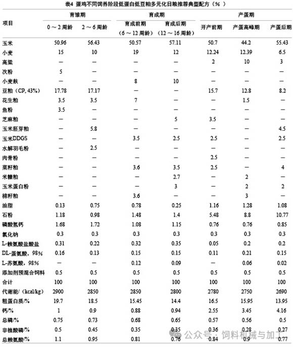 3.2 小麦、大麦和高粱替代玉米 蛋鸡育雏期日粮中,小麦、大麦或高粱搭配使用时,玉米用量可降低至 15%左右。蛋鸡育成期和产蛋期日粮中,小麦、大麦和高粱用量均可到 40%,搭配使用并添加相应的酶制剂,玉米用量可降低为 0,在产蛋期日粮中需要补充色素。 3.3 杂粕等蛋白原料替代豆粕 蛋鸡育雏期日粮中,可单独或搭配使用棉籽饼粕、菜籽饼粕替代豆粕,建议替代比例不超过 5%,维持 15% 以上的豆粕用量。蛋鸡育成期日粮中,可搭配使用棉籽饼粕、菜籽饼粕、葵花粕、米糠粕替代豆粕,每种杂粕用量建议在 5% ~ 8% 之间,替代豆粕用量 15% 左右;蛋鸡产蛋期日粮中,可搭配使用棉籽饼粕、菜籽饼粕(各8%~10%)和玉米蛋白粉(3%~5%)替代豆粕,豆粕用量可降至 8% 以下。 3.4 无豆粕日粮配方 蛋鸡育成期和产蛋期日粮中,搭配使用玉米蛋白粉(最高 5%)、菜籽饼粕(最高15%)、棉籽饼粕(最高 10%)、花生粕(最高10%)、葵花粕(最高 8% )和棕榈仁粕(最高5% ),豆粕用量可降低为 0。 4 蛋鸡低蛋白低豆粕多元化日粮推荐典型配方 蛋鸡不同饲养阶段低蛋白低豆粕多元化日粮推荐典型配方见表 4。 |
