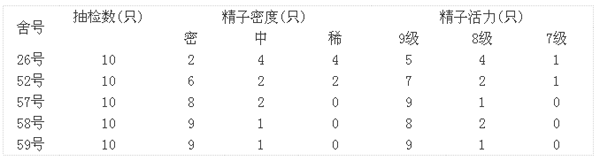 检查精子活力要注意以下几点: 1)大量观察后才能做出正确判断。 2)制作镜检样品时,精液不要太多,以布满盖玻片而不溢出为宜,并不能有气泡。 3)检查时最好在暗视野下观察。 4)在40—42℃的温度下进行。 5)采精后应立即检查。 6)要晃动精液试管,待混匀后,再取一滴精液升温检查。 2.2.2.4化验结果 对50份精液显微镜检查的具体结果如下: 3、治疗 针对上表每栋鸡舍的情况,须采取不同的措施: 3.1如:59号舍,精子密度、活力都较好,而受精率却很低,初步怀疑为授精过程中的问题。经过调查发现,授精人员技术不太熟练,一次输精持续的时间太长,且没有注意精液的保温。 建议:采精时,不要用生理盐水稀释。输精时,取一分装管(10ml)加入一半原精,然后加一半稀释液,混合后马上输精。每只母鸡给予0.05ml,30分钟内输完,在整个过程中,手应握紧分装管,以保证精液的温度。原精与稀释后的精液受精效果差异不显著,但是稀释后精液的保存时间不得超过30分钟,而原精可保存60分钟。值得一提的是,由于公鸡的精液具有射精量少、浓度高、精子体外代谢旺盛、存活时间短等缺点,但稀释后的精液可以克服这些缺点,达到生产所需的四点要求: 1)扩大精液容量,保证精液中精子均匀,提高公鸡利用率。 2)冲淡透明液减少其对精子活力的不良影响到。 3)补充营养,减少精子本身的能量消耗,延长精子的存活时间。 4)有利于精子的保存,故提倡精液稀释。 3.2针对其它鸡舍种鸡精液稀的现象,采取隔离饲养的方法。如:52号舍,测10只,有2只精液较稀,但精子活力好。此时把精液稀的鸡挑出隔离,在日粮中补加酶制剂、VC、VE、鸡蛋等营养物质,加强营养。但这时该鸡的精液不能用于授精,需要根据外观品质检测观察一段时间。精液逐渐恢复正常的继续留作种用,仍不能好转的给予淘汰。 4、治疗效果 治疗前后8、9月份该五栋鸡舍的受精率对比如下(以百分比表示): 由上表可见,采取措施后,种鸡受精率大幅度提高,治疗效果明显。 |