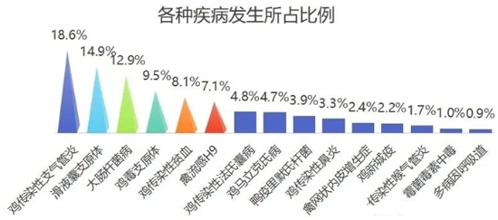 3、本月确诊禽病发生比例 说明: (1)本月确诊疾病发生比例较高的疾病依次为传染性支气管炎、滑液囊支原体、大肠杆菌病、鸡毒支原体,鸡传染性贫血占确诊疾病的总体比例在64%。支原体、传染性支气管炎、大肠杆菌病的发生比例相对较高。 (2)三类疾病防控重点:垂直传播性疾病重点为支原体病;免疫控制性疾病的防控重点为传染性支气管炎;环境条件性疾病防控的重点是大肠杆菌病。 二、2025年10月份禽病防控重点 1、当前流行疾病的防控 ①传支是仍然是当前发生比例较高的疾病,传支由于毒株型众多而且能够通过空气传播,防控难度较大,被定义为环境条件性免疫控制性疾病,需要经过免疫和环境控制的综合防控手段才能有效防控。首先在毒株选择方面选择两种交叉保护谱比较广的疫苗进行免疫,在选择疫苗时需要考虑疫苗毒株的毒力,强毒株的疫苗早期使用能够破坏黏膜屏障,为野毒的感染提供了便利条件;其次在免疫时机上1日龄的占位免疫尤为重要,起到启动免疫和占领结合位点的作用;在饲养管理方面由于鸡群对温度的敏感性不同,需要根据鸡群的日龄阶段为鸡群提供适宜均匀稳定的环境。 ②支原体病由于其感染的普遍性,感染之后在体内长期存在,并且在鸡群体质差的情况下会迅速繁殖,对鸡群造成生产性能方面的影响,是鸡群健康的潜在威胁。由于其能够在细胞内生存,具有免疫逃逸的功能,既能够垂直传播又能够水平传播,鸡群的感染率发病率比较高,需要综合防控措施才能得到有效的控制。首先要提升饲养管理水平,降低各种应激,避免各种应激的叠加,保证鸡群的体质;其次在易感地区或者场区建议使用活+死的免疫方式,降低鸡群的感染机率以及对机体造成的损失;第三,及时的监测,在鸡群的关键日龄、应激叠加的阶段或者应激不可控的情况下,进行支原体的预防性投药。 ③大肠杆菌病属于环境条件性疾病。大肠感染染后多表现为三炎的症状,由于其是环境常在菌,发生的机率比较大。对大肠杆菌的防控需要分清楚是原发性的还是继发性。原发性的大肠杆菌要环境控制方面入手,降低环境中的大肠杆菌的含量。从鸡舍的环境、饲料、饮水方面控制微生物含量,避免病从口入。针对继发性的大肠杆菌病需要找到原发性的原因,先控制原发病因,才能有效控制大肠杆菌的发生。在治疗时需要进行药敏试验,找到敏感药物科学使用药物才能有效的降低疾病的损失。 2、11月份预计流行疾病防控 (1)流行疾病中的传支、支原体、大肠杆菌病等在一定时间内仍会维持在较高的发病比例。 (2)进入寒冷的阶段,要重视生物安全的防控,对5种传播途径的切断方法及时的进行调整,保证无疾病传入。 |