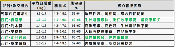 一、肉牛育肥模式的选择 肉牛育肥模式从不同的角度可以分出若干个方法。可以按饲养方式、饲养类型、育肥时间长短、育肥目标四个角度来关注。 (一)按饲养方式分类 1. 舍饲育肥模式(全程圈养,精准饲喂),肉牛全程在牛舍内饲养,可以做到人工精准控制采食和环境。 2. 放牧育肥模式(草场采食,低成本),也叫草饲肉牛,全程都是在草场上,适合有丰富草地资源的地区。 3. 半舍饲育肥模式(半放半圈,兼顾效益),会给牛投喂部分精饲料。 (二)按饲料类型分类 1. 谷饲(精料型)育肥模式,主要是精料喂养,精料占比70%-90%,快速增重。 2. 草饲育肥模式,主要是粗料喂养,粗饲料占比70%以上,成本低。 3. 混合饲料育肥模式,精粗青搭配,均衡营养来饲养育肥。现在的肉牛育肥场在育肥的前期和中期基本是混合饲料育肥模式。 (三)按育肥时间长短分类 1. 短期育肥模式,3-6个月,适合大架子牛育肥,以“快速增重”为目标,快速出栏。 2. 中期育肥模式,7-10个月,前期侧重骨架发育,后期侧重肌肉和脂肪积累(提高精饲料比例)。 3. 长期育肥,11个月以上,以“提升肉质风味为核心”注重肌间脂肪(雪花肉)沉积和肉品嫩度,主要生产高端肉质牛肉。 (四)按育肥目标分类 1. 增重型育肥模式,追求最大化日增重。 2. 成本优化育肥模式,低成本育肥,控制养殖成本、效益最大化。 3. 肉质型育肥模式,差异化育肥、生产中高档牛肉。 如何选择育肥模式? 一是根据自己的资源禀赋,选择饲养方式。二是根据目标日增重和肉品要求以及周转计划选择饲料类型。三是根据入栏和出栏体重及肉品要求选择育肥时间长短。四是根据育肥目标,选择育肥方法。 二、普通高效育肥技术 普通育肥:是大众化、易复制的常规养殖模式,以“满足基础生长需求、控制成本、稳定出栏”为核心。 普通育肥技术如何升级?不外乎两种,一是增产增效,二是降本增效。我们主要在肉牛品种选择、精准育肥技术、把控好环境控制与管理三个方面介绍。 (一)肉牛品种选择 1. 纯种肉牛育肥的特点 优点:品种纯度高,性状稳定,比如安格斯、西门塔尔纯种,产肉品质(如大理石花纹)更统一。可作为亲本培育杂交后代,保留优良品种特性。 劣势:是生长速度较慢,饲料转化率一般,适应性较低,养殖成本偏高。 主要肉牛品种生产性能比较 |
