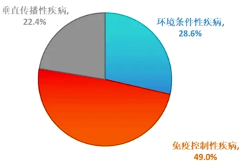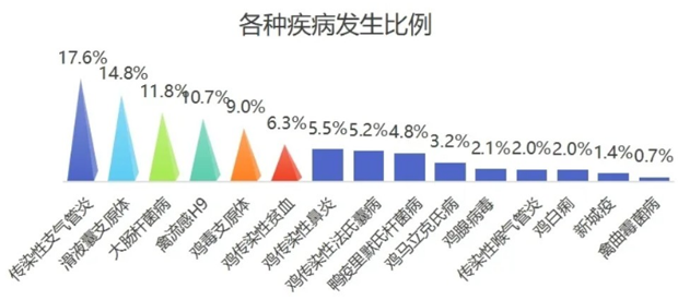 说明:根据平台数据统计,传染性支气管炎、滑液囊支原体、大肠杆菌病、禽流感H9、鸡毒支原体属于长期占据排行榜前几名的疾病,其发病比例占到所有疾病的64%左右。这5种疾病的常在性和病原的易变异、易感染的特点导致其在鸡群中多发混感,是行业重点关注、重点防控的疾病,需要饲养管理和疾病防控手段同时采取措施才能有效防控的疾病。