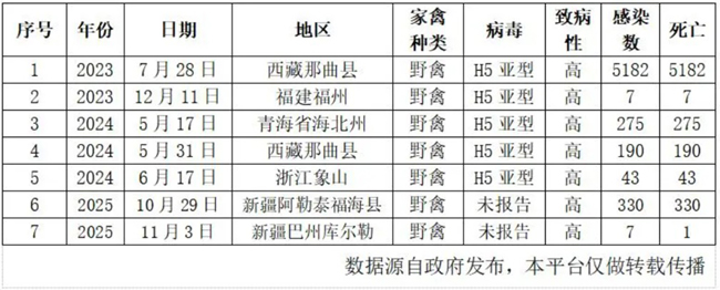 ④传染性鼻炎属于免疫控制类疾病,但单独的依靠免疫不能达到100%的防控效果。传染性鼻炎的控制首先需要进行程序性的疫苗免疫,提升鸡群体液抗体的水平,免疫地区流行株或者自家株疫苗的效果最佳;其次在换季以及冷应激易发的时间段提升管理水平,避免鸡群发生冷应激,同时可以进行鼻炎水苗的注射,提升抗体水平,保证鸡群对鼻炎细菌的抵抗力。 2、2月份预计流行疾病防控 (1)进入冬春季,外界气温差别变大,鸡群发生冷应激的机率增加,流行疾病中的传支、支原体、大肠杆菌病等在一定时间内仍会维持在较高的发病比例。 (2)进入换季的阶段,低温多风天气较多,病毒性疾病的流行更加便利,要重视生物安全的防控,对5种传播途径的切断方法及时的进行调整,保证无疾病传入。 (3)关注冬季鸡群体质的保持,确保免疫控制性疾病的抗体水平,及时的进行补免,确保鸡群健康。 (4)关注新毒株的禽流感疫苗的使用,及时的进行免疫,同时尽快完成2次免疫,提升特异性抗体的水平。 (5)冬春季禽流感疾病高发,欧州、美洲、亚洲邻国禽流感发病严重,严格控制野鸟,避免其对禽流感疾病的传播。 三、重大禽病疫病信息 禽流感发病情况 国际: 据OIE的最新报告,2025年第50周至2026年第1周全球共计报告1495例新发的家禽、野禽和哺乳动物高致病性禽流感,为H5和H7亚型。 国内: |