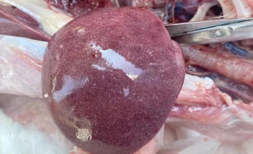 呼肠孤是现在制约肉鹅育雏成活率仅次于痛风的第二大疾病。如果在市场上遇到呼肠孤的时候可以参考下面的解剖图片去甄别诊断,可以通过肝、胆、脾去判别,以下解剖图都是非常典型的症状。
