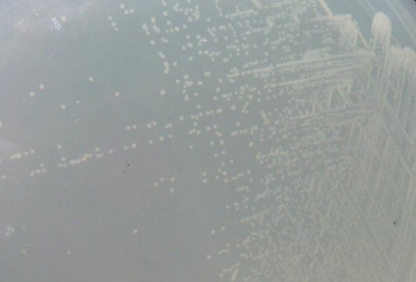 2.3 实验室检测 采集病死猪的心脏、关节腔积液和腹腔积液进行细菌的分离培养和“卫星现象”鉴定检测。 2.3.1 Gps的分离培养 在无菌操作条件下从病料中取样接种于 TSA(胰酪大豆胨琼脂) 培养基,置于37℃恒温培养箱中培养24 h后,TSA平板上长出灰白透明0.3~0.5 mm大小的圆润光滑菌落(见图3)。 图3 Gps在TSA培养基上生长形态 从TSA培养皿中挑取疑似Gps菌落涂片进行革兰氏染色镜检,光学显微镜(×1 000)下观察,可见长度不等的革兰氏阴性小杆菌和球杆菌,无鞭毛和芽孢(见图4)。 图4 Gps革兰氏染色镜检图片 2.3.2 “卫星现象”鉴定 挑取疑似Gps菌落,在未添加NAD(烟酰胺腺嘌呤二核苷酸)的TSA 平板上水平划线接种,再挑取金黄色葡萄球菌垂直于Gps水平线划线,37℃恒温培养48 h后,TSA平板上出现明显的“卫星现象”(见图5)。 |