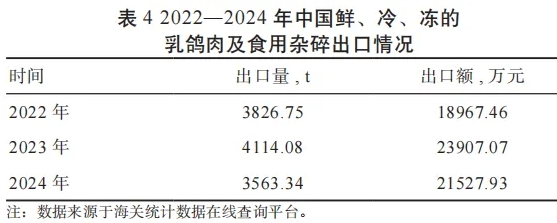 珠三角地区的广东省肉鸽产业发展较为迅速,该省是传统的肉鸽生产和消费区域,且紧邻香港、澳门两大肉鸽消费地。1980 年,广东省光明农场大宝鸽场建立,这是我国最早的肉鸽规模饲养场,其肉鸽饲养规模占全国的 50% 左右,养殖技术、规模化程度和消费量均处于全国领先水平。广东省的肉鸽养殖主要集中在清远、茂名、兴宁等地。其中,清远市占全广东省肉鸽养殖规模比重达 20%;茂名的“茂南白鸽”入选广东省农业农村厅公布的 2023 年度“粤字号”农业品牌目录区域公用品牌名单;兴宁肉鸽年出栏量高达 5 750 万只,占全省总量的 15%,成为了广东重要的肉鸽产地和集散地。 长三角地区的江苏省截至2021年底,种鸽存栏量约 230 万对,蛋鸽约 100 万只,年产商品肉鸽约 4 000万只、商品鸽蛋约 5 000 万个,肉、蛋鸽产值超 10 亿元。上海市近 3 年鸽场产能稳定在 65 万对,种鸽存栏量基本稳定在 50 万对以上,总体呈现稳中略升的趋势。2023年种鸽存栏 52.70 万对,乳鸽年产量稳定在795 万只左右。 京津冀地区的河北省注重肉鸽品种的改良和养殖技术的创新,通过引进国外先进品种和技术,提高了肉鸽的品质和市场竞争力。特别是,河北省阜平县打造了特色硒鸽产业,以种鸽繁育为核心,以硒鸽养殖为纽带,形成了生态循环产业集合体,2023 年获评国家肉鸽良种繁育标准化示范区,规模养殖产值达 14 亿元。 西北地区的新疆维吾尔自治区在肉鸽生产中优势明显。在喀什等维吾尔族群众聚集的地区,乳鸽市场需求旺盛,肉鸽养殖量和消费量每年以 15%~20% 的速度增长。研究统计,喀什 433 万维吾尔族百姓,年人均食用肉鸽约 15 只,年均消费量达到 6 000 多万只,需求缺口非常大,使得近年来新疆养鸽业发展迅速。新疆肉鸽主产区主要集中在和田、喀什、阿克苏等地,和田地区是新疆肉鸽养殖的领头羊,其养殖规模和产量均位居全疆前列。2023年末,和田鸽存栏量达到 500 万羽,出栏量更是高达 2 100 万羽,在西北 5 省中排名第一。 2.3 贸易情况 出口方面,中国肉鸽主要出口中国香港和澳门地区。根据中国海关数据(表 4),2022—2024年3年间中国鲜、冷、冻的乳鸽肉及食用杂碎出口呈现先升后降的趋势。2023年肉鸽出口量显著增加,一方面,香港取消防疫措施和恢复全面通关,经济活动有所恢复,带动肉鸽消费提升;另一方面,2023年7月1日起,全品类内地鲜活食品可在指定时段经港珠澳大桥供港。大桥 24 h 通关及拱北海关“绿色通道”的便利措施,满足了鲜活食品的时效需求,缩短了运输时间,降低了成本,提升了内地肉鸽在港澳的竞争力。因此,2023年供港澳地区的鸽产品总量同比增加了7.51%。2024年,受到香港经济下滑和消费降级趋势双重影响,乳鸽出口量(3 563.30 t)比2023年下降了13.39%,但乳鸽价格出口价格创历史新高(8 488 美元/t),比2023年提高了 2.60%。 2.4 品种情况 根据《国家畜禽遗传资源品种目录(2024年版)》,当前我国肉鸽主要品种有 13 个,较2021年版新增 4 个,这一突破离不开国家种业振兴行动的支持,鸽业种业和肉鸽种质资源保护利用能力均得到明显提升。具体来看,地方品种 6 个,包括石岐鸽、塔里木鸽、太湖点子鸽,以及新增加的豫中鹁鸽、鹤秀鸽、黑皂鸽;培育品种 3 个,包括天翔1号、苏威1号及新增的翱丰1号;引入品种 3 个,包括美国王鸽、银王鸽、卡奴鸽;引入配套系品种 1 个,为欧洲肉鸽。 |